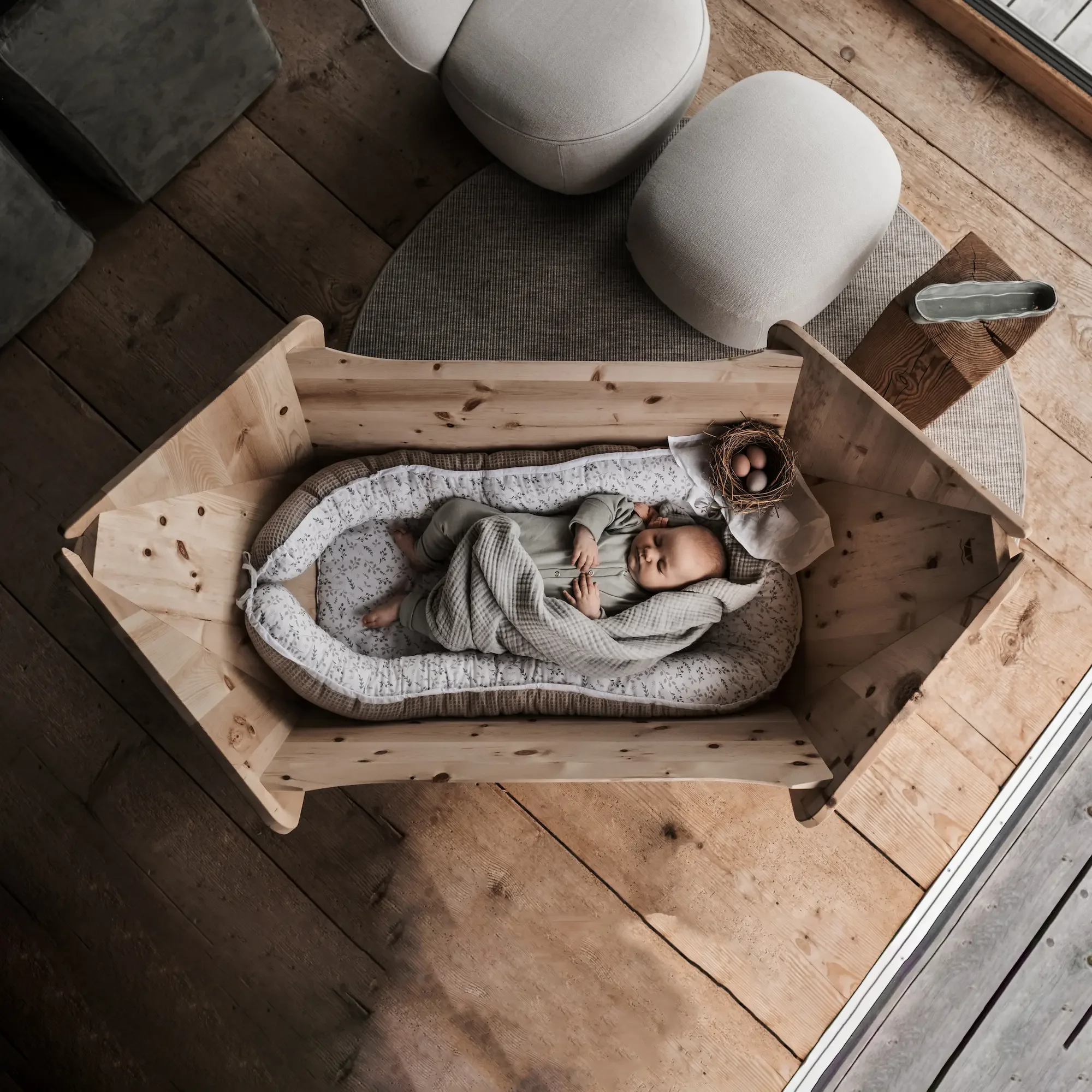 “Ein Ort aus Zirbenholz, der Dein Kind über viele Jahre begleiten kann: Vom ersten Schlaf bis zum Spielschiff und Rückzugsort.”